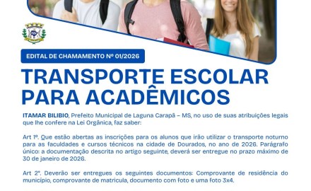 A Prefeitura Municipal de Laguna Carapã, por meio do Edital de Chamamento nº 01/2026, informa que estão abertas as inscrições para o Transporte Escolar destinado a acadêmicos, referente ao ano letivo de 2026.