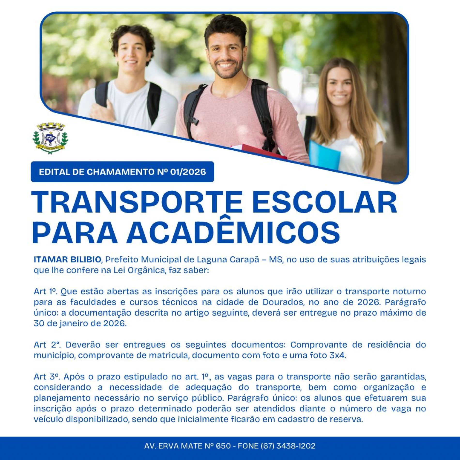 Prefeitura de Laguna Carapã abre inscrições para transporte escolar universitário em 2026